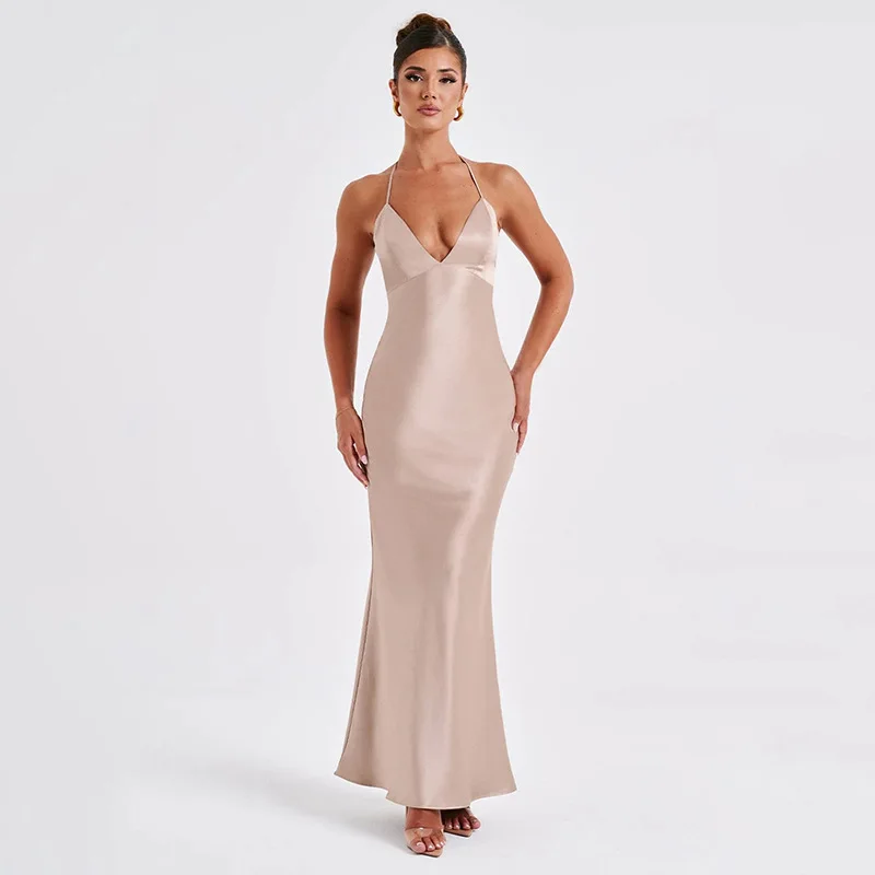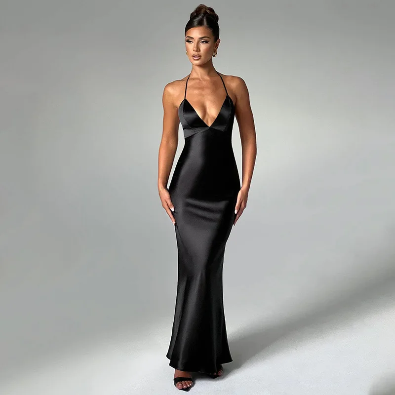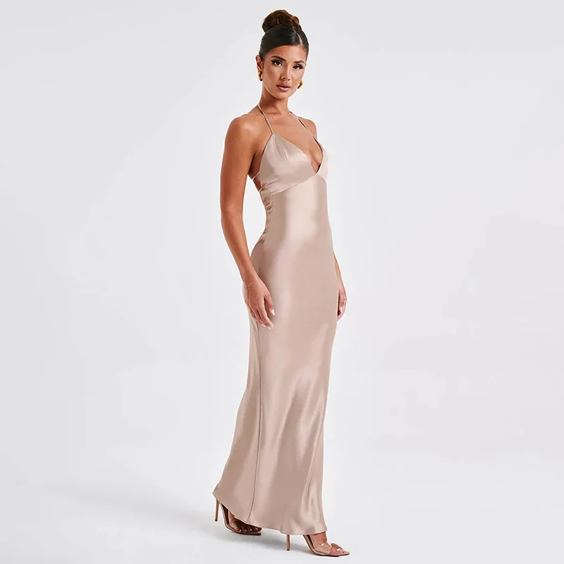Satin Sexy Sleeveless Backless Slim Fit Bodycon Dress for Women Elegant Party Evening Long Dress